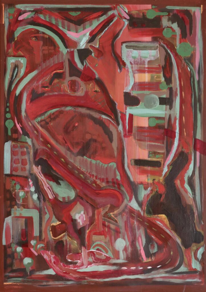 Meine Malerei lässt sich außerdem in zwei Hauptaspekte einteilen. In den Aspekt bei dem die Figur im Raum ist und den Aspekt in dem der Raum in der Figur ist. Denn wie in der Literatur strebt meine Malerei nicht nach der Nachahmung des Raums, sondern nach einer symbolischen Abbildung des Raums – durch Zeichen, die den äußeren Raum relativieren und interpretieren. Die beiden Begriffe „Zeichen“ und „Zeichnung“ sind ja miteinander verwandt – sie stammen beide vom Verb „zeichnen“ ab. Eine Zeichnung und ein Buchstabe sind dabei eine spezielle Form eines Zeichens. Durch diesen etymologischen Zusammenhang wird die Verwandtschaft zwischen erzählender Literatur und malerischen Symbolismus noch eindringlicher verdeutlicht.